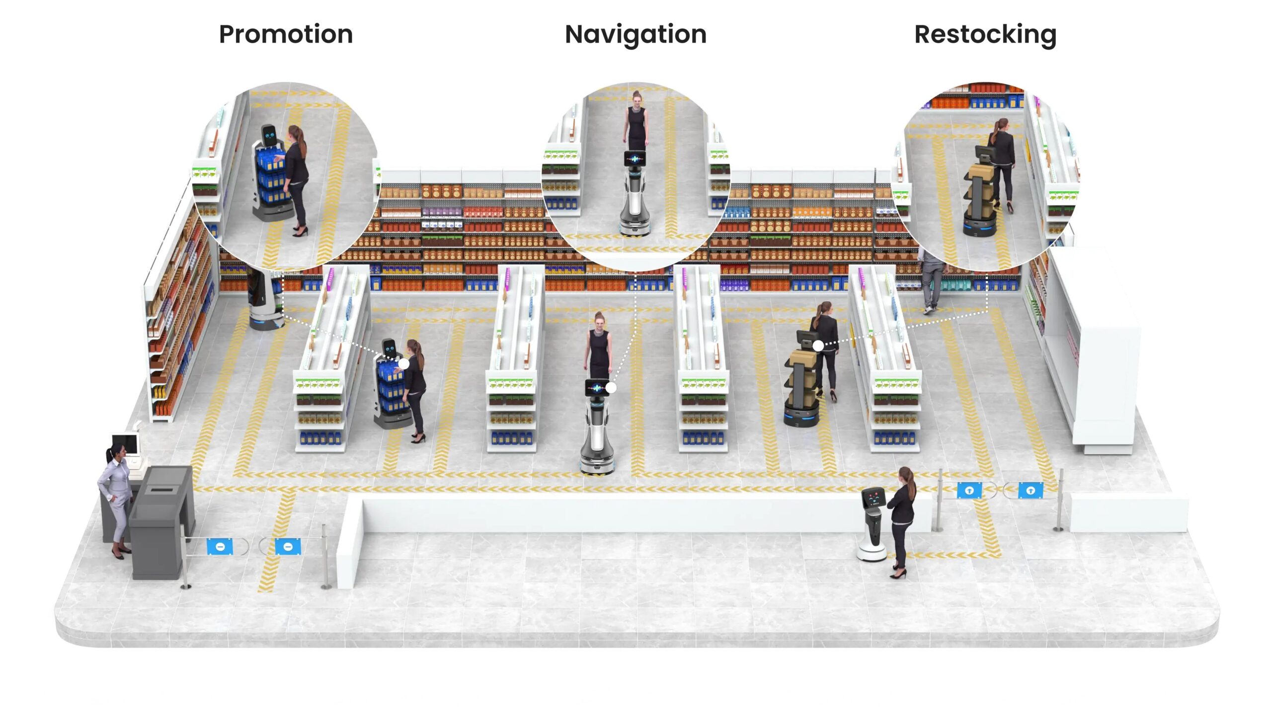 - Large chain supermarkets often have vast areas and a wide variety of products. Robot Promoters provide guidance and help find items, saving customers time. On average, each robot conducts 60+ navigations per day.